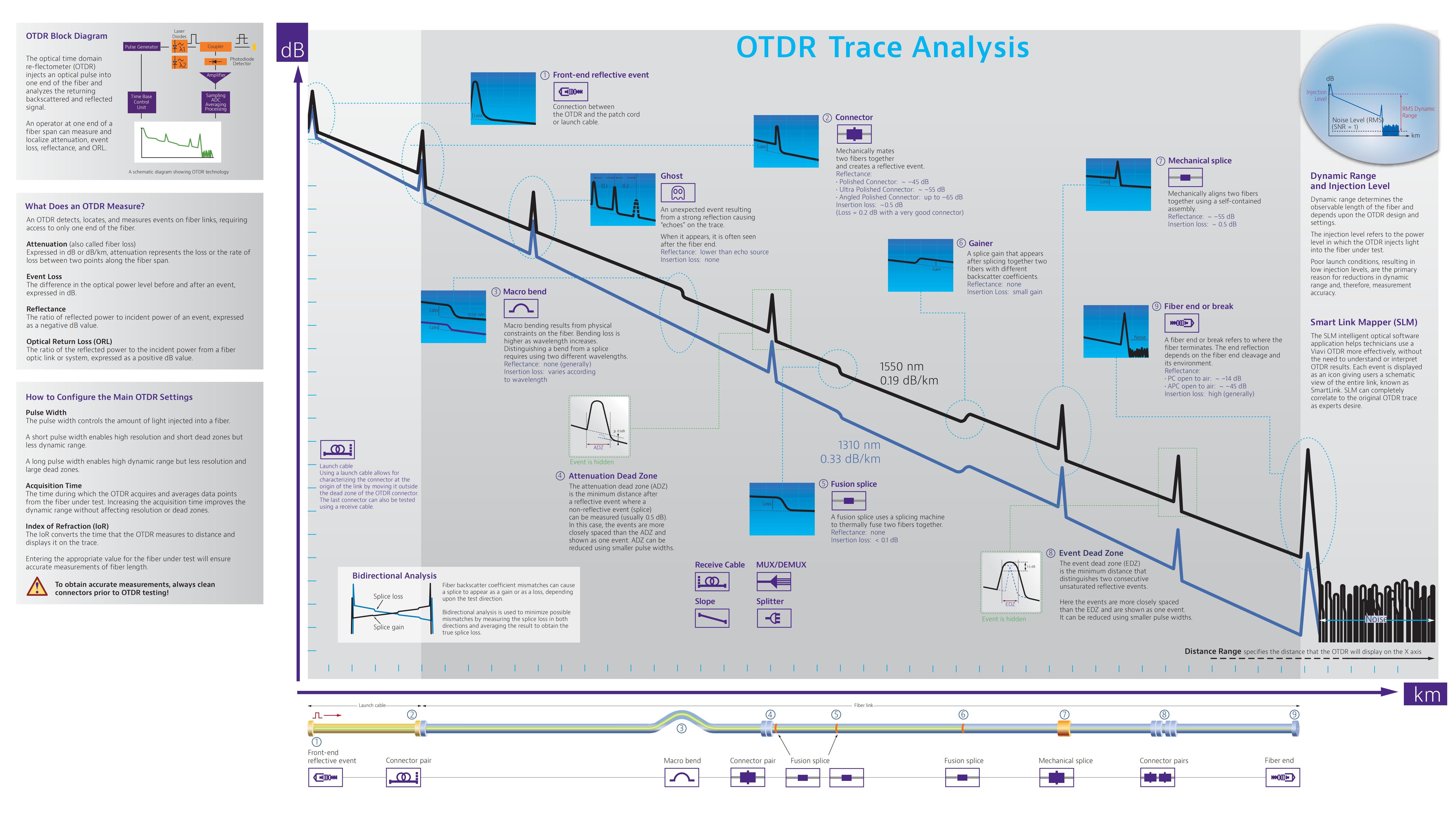 How to read an OTDR's trace analysis ? An optical time-domain reflectometer (OTDR) is an optoelectronic instrument used to characterize an optical fiber. It is the optical equivalent of an electronic time domain reflectometer which measures the impedance of the cable or transmission line under test. An OTDR injects a series of optical pulses into the fiber under test and extracts, from the same end of the fiber, light that is scattered (Rayleigh backscatter) or reflected back from points along the fiber. The scattered or reflected light that is gathered back is used to characterize the optical fiber. The strength of the return pulses is measured and integrated as a function of time, and plotted as a function of length of the fiber.